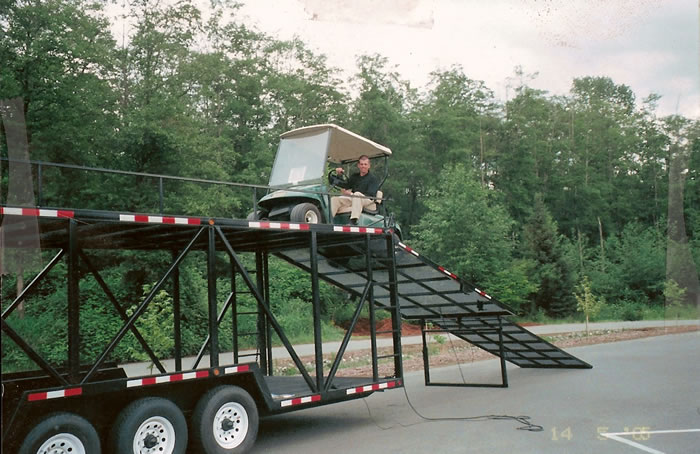 We have custom built these type of trailers for Hauling Boats and Golf Carts. Unique feature is the Double Folding winch operated Draw Bridge Gate for loading and unloading.